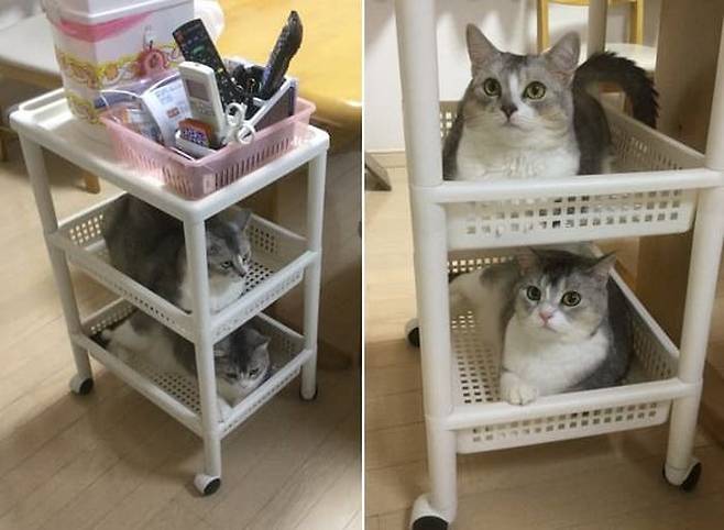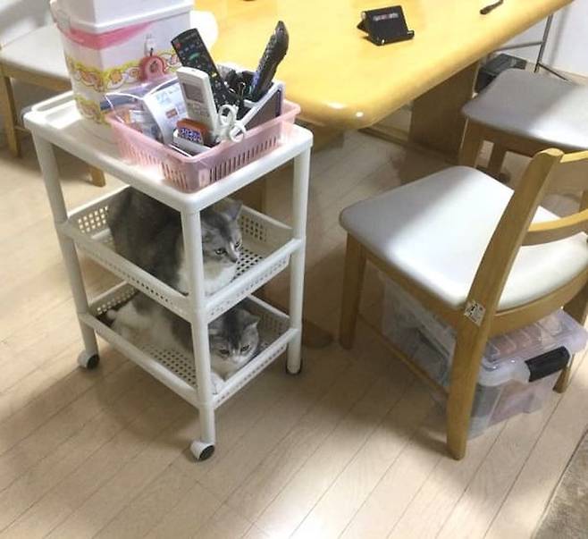 누가 봐도 캣타워가 아님에도 불구하고 이동식 수납 선반이 너무 좋아 보였는지 그 안에 쏙 들어가 있는 고양이들 모습이 허탈감을 감추지 못하게 하는데요.