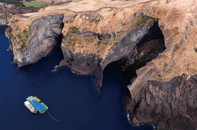 검멀레해변은 우도봉의 동쪽에 자리합니다. 검멀레는 ‘검은 모래’라는 뜻으로 이름처럼 검은 모래사장 옆으로 얇은 퇴적암이 층층이 쌓인 거대한 바위가 서 있습니다. 퇴적층에는 콧구멍처럼 뚫린 거대한 해식동굴이 있습니다. 동굴보트를 이용하면 가까이에서 웅장한 동굴을 마주할 수 있습니다. 제주 본섬으로 돌아와 구좌읍 종달리에 자리한 지미오름에 오르면 소머리부터 꼬리까지 길게 이어져 있는 우도의 독특한 형상을 한눈에 볼 수 있습니다.