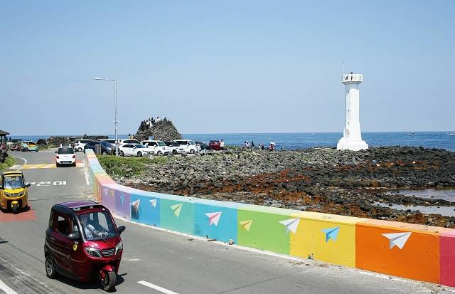 해변을 빠져나와 하우목동항을 지나 동쪽으로 향하면 현무암을 쌓아올려 만든 망루와 눈부시게 하얀 득생곶등대를 만납니다. 등대 옆 바다에는 전통 어업 방식을 재현한 원담(독살)이 있습니다. 밀물 때 바닷물을 타고온 물고기가 빠져나가지 못하도록 가두는 일종의 돌 그물로 옛 제주인의 생활상과 지혜를 엿볼 수 있습니다.