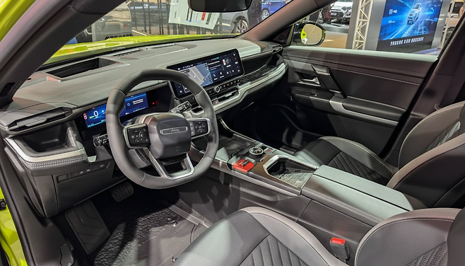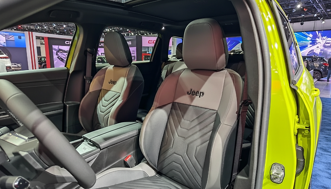 컴패스 일렉트릭은 전장 4,552mm, 전폭 1,928mm, 전고 1,675mm, 휠베이스 2,795mm로 기존 모델 대비 차체 크기가 커졌다. 각진 LED 매트릭스 헤드램프와 지프의 상징인 7개 슬롯 상단 그릴이 전면부의 정체성을 확립한다. 후면은 "X"자 형태의 테일램프로 독특한 인상을 남기며, 하와이 그린과 벌칸 색상의 루프로 마감된 투톤 컬러 옵션도 제공된다. STLA 미디엄 플랫폼 덕분에 실내 공간이 대폭 확대돼 뒷좌석 레그룸이 55mm 증가했으며, 전면 수납공간은 34리터로 늘어났다. 트렁크 용량도 45리터 증가해 최대 550리터에 달하며, 40:20:40 분할 폴딩 시트를 표준으로 제공해 적재 유연성을 극대화했다.
