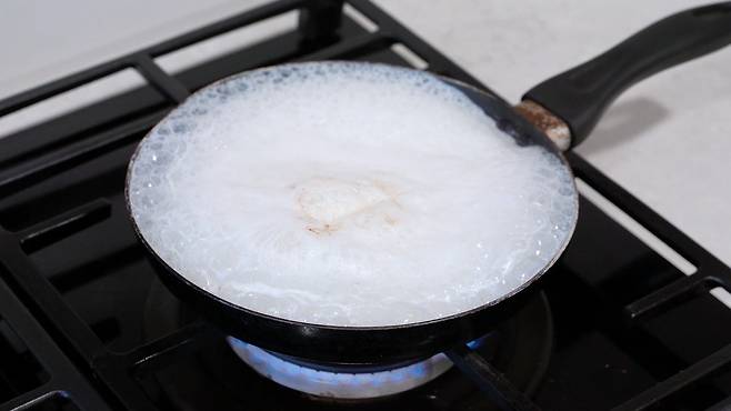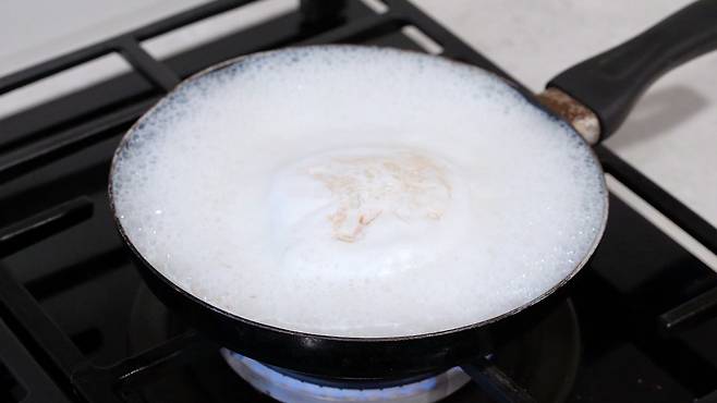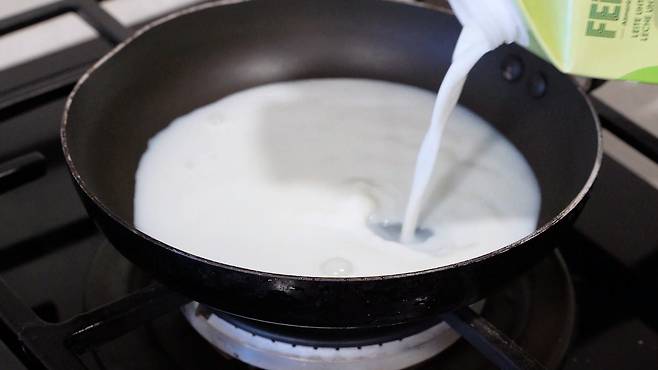 깨끗해진 후라이팬에 우유를 붓고 강불에 끓어오르기 전까지 팔팔 끓이세요. 우유의 양은 후라이팬의 절반 이하까지만 부어 주세요. 너무 많이 끓이면 끓어 넘치기 쉽답니다.