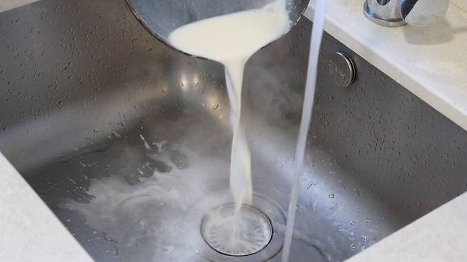 3분이 지나면 팔팔 끓은 우유를 찬물과 함께 배수구에 버려 주세요. 너무 뜨거운 우유를 바로 버리면 배수관이 망가질 수 있어요.
