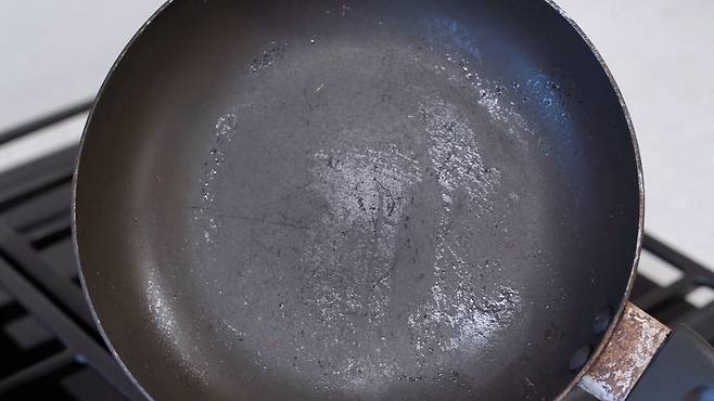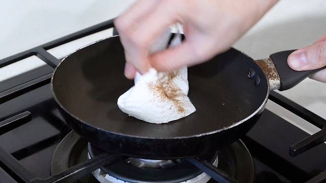 먼저 더러워진 후라이팬을 깨끗이 닦아 주세요. 주방세제나 키친타월을 이용해 이물질을 모두 제거해 줍니다.