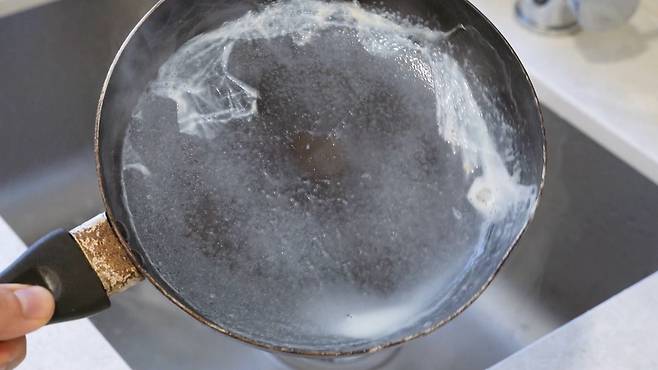 우유막이 붙은 후라이팬은 주방세제와 따듯한 물을 이용해 살살 닦은 후 건조 시켜주세요.