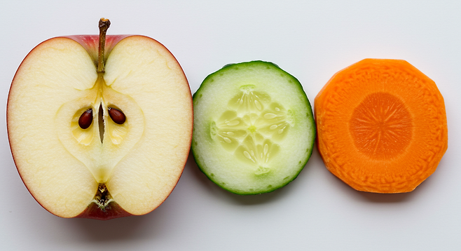 - 사과, 오이, 당근 등 씹어서 먹는 과일이나 채소는 씹는 과정에서 잇몸과 치아에 붙은 플라그를 제거하는 효과가 있습니다.