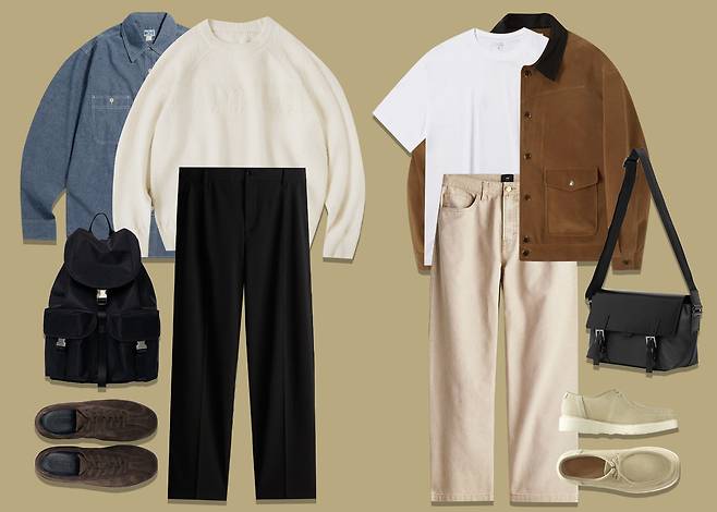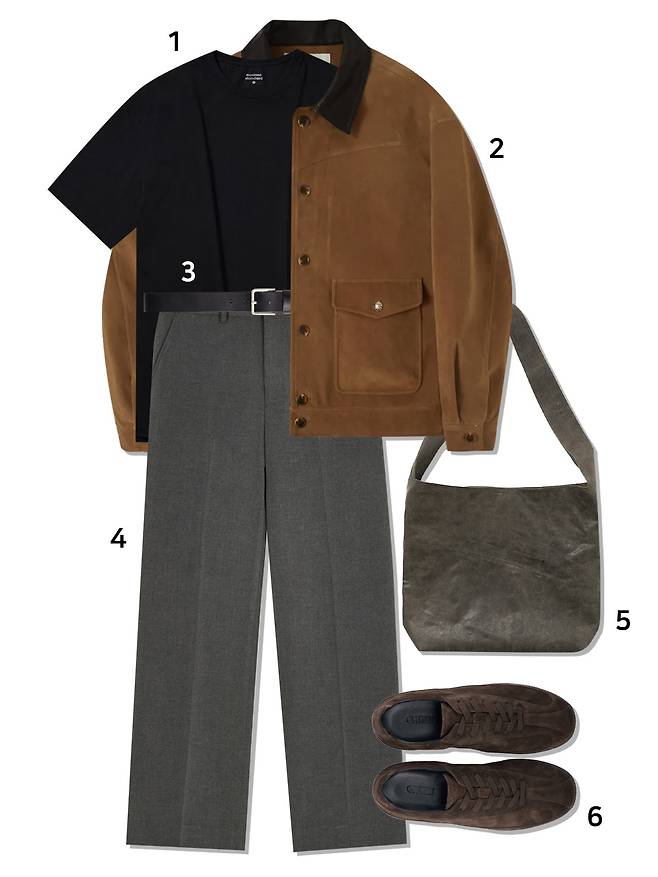 1 티셔츠 : 무신사스탠다드(1+1/37,800원) 2 워크재킷 : 라퍼지스토어(105,400원) 3 벨트 : H&M(29,900원) 4 슬랙스 : 브랜디드(89,000원) 5 가방 : 밀로아카이브(148,000원) 6 슈즈 : 페몬트(169,000원)