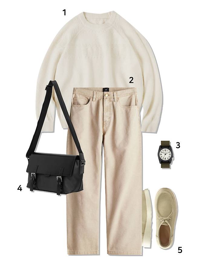 1 니트 : 라퍼지스토어(99,800원) 2 팬츠 : H&M(39,900원) 3 시계 : 베르투치(128,000원) 4 크로스백 : 베드포드11(199,000원) 5 슈즈 : 커스텀메이드 리퍼블릭(112,000원)