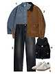 1 데님셔츠 : 브론슨(74,000원) 2 워크재킷 : 라퍼지스토어(105,400원) 3 데님 : H&M(54,900원) 4 백팩 : 하아카이브(159,000원) 5 스니커즈 : 조셉트(99,000원)