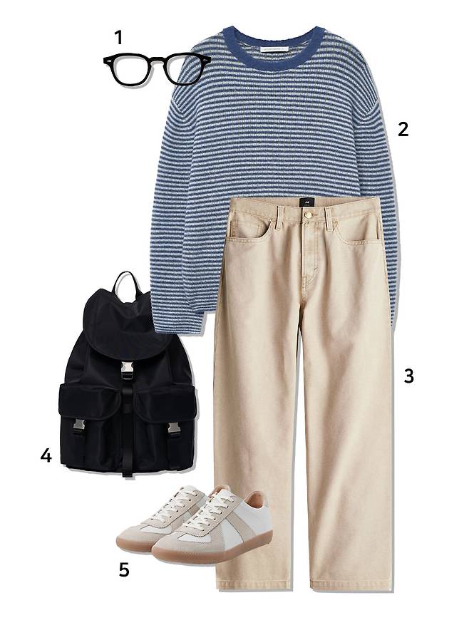 1 안경 : BVH(168,000원) 2 니트 : 인템포무드(79,000원) 3 팬츠 : H&M(39,900원) 4 백팩 : 하아카이브(159,000원) 5 스니커즈 : 조셉트(99,000원)