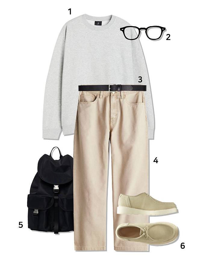 1 스웨트셔츠 : H&M(17,900원) 2 안경 : BVH(168,000원) 3 벨트 : H&M(29,900원) 4 팬츠 : H&M(39,900원) 5 백팩 : 하아카이브(159,000원) 6 슈즈 : 커스텀메이드 리퍼블릭(112,000원)