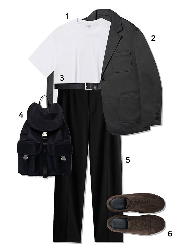 1 티셔츠 : 무신사스탠다드(1+1/37,800원) 2 재킷 : 유니온블루(208,000원) 3 벨트 : H&M(29,900원) 4 백팩 : 하아카이브(159,000원) 5 팬츠 : H&M(49,900원) 6 슈즈 : 페몬트(169,000원)