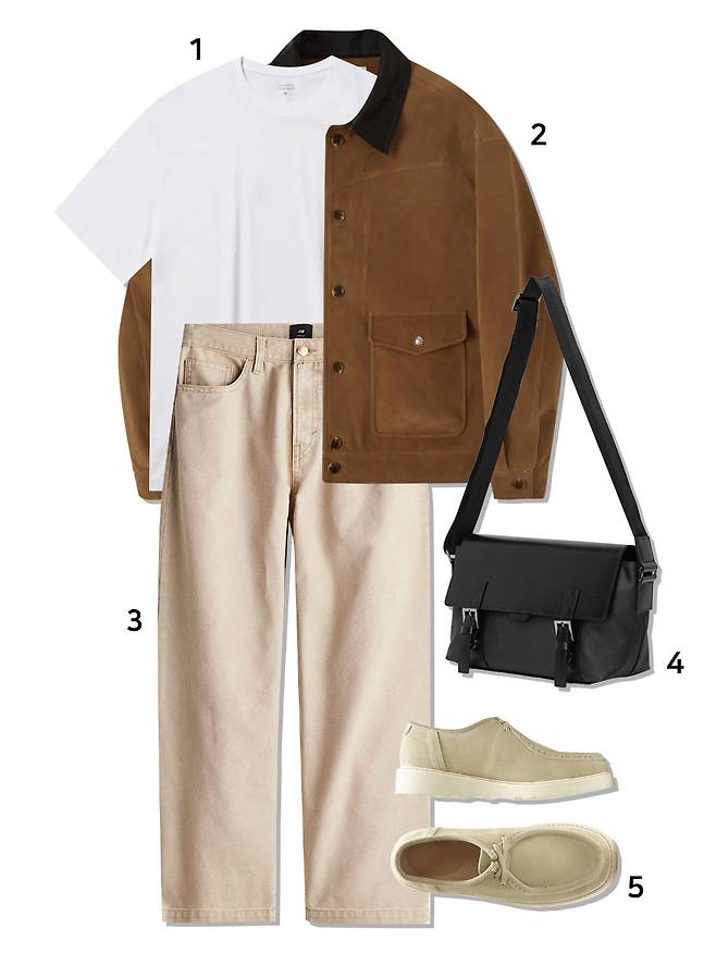 1 티셔츠 : 무신사스탠다드(1+1/37,800원) 2 워크재킷 : 라퍼지스토어(105,400원) 3 팬츠 : H&M(39,900원) 4 크로스백 : 베드포드11(199,000원) 5 슈즈 : 커스텀메이드 리퍼블릭(112,000원)