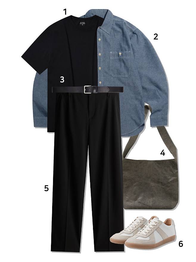 1 티셔츠 : 무신사스탠다드(1+1/37,800원) 2 데님셔츠 : 브론슨(74,000원) 3 벨트 : H&M(29,900원) 4 가방 : 밀로아카이브(148,000원) 5 팬츠 : H&M(49,900원) 6 스니커즈 : 조셉트(99,000원)