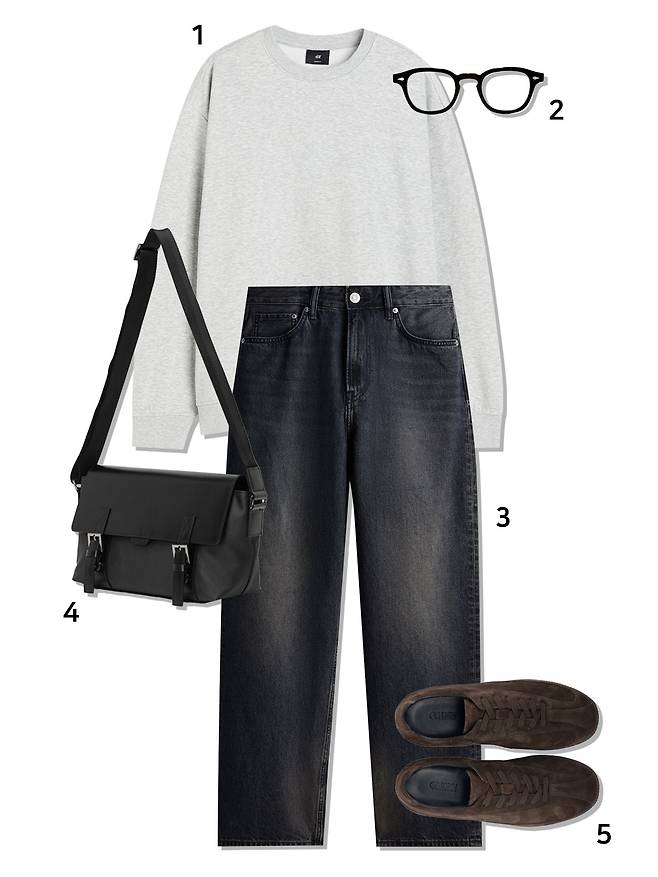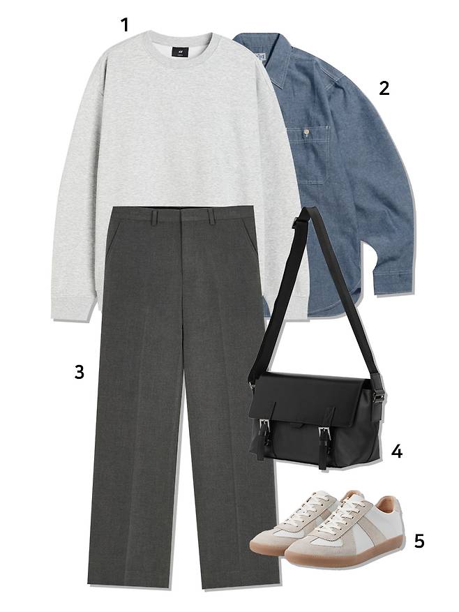 1 스웨트셔츠 : H&M(17,900원) 2 데님셔츠 : 브론슨(74,000원) 3 슬랙스 : 브랜디드(89,000원) 4 크로스백 : 베드포드11(199,000원) 5 스니커즈 : 조셉트(99,000원)