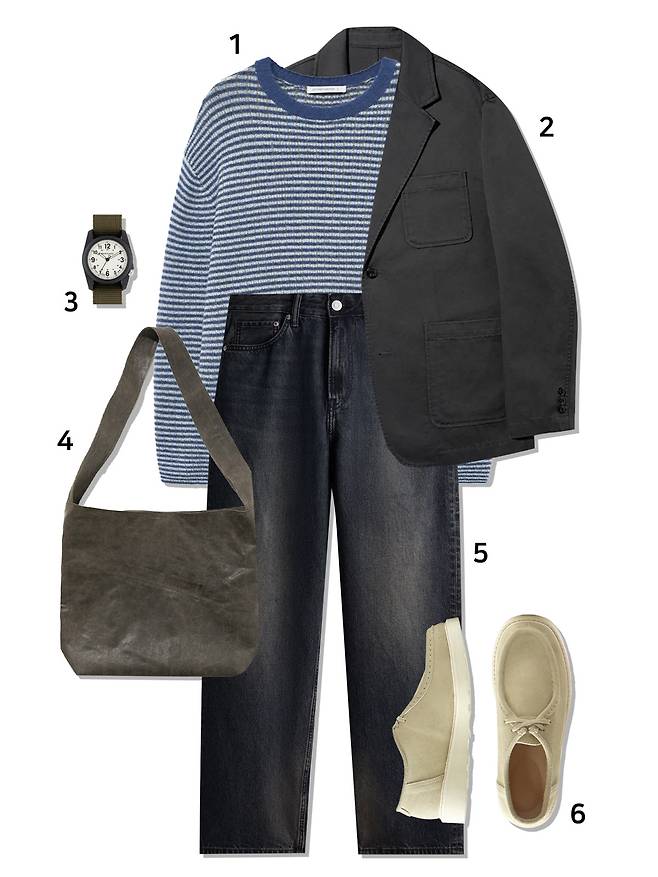 1 니트 : 인템포무드(79,000원) 2 재킷 : 유니온블루(208,000원) 3 시계 : 베르투치(128,000원) 4 가방 : 밀로아카이브(148,000원) 5 데님 : H&M(54,900원) 6 슈즈 : 커스텀메이드 리퍼블릭(112,000원)