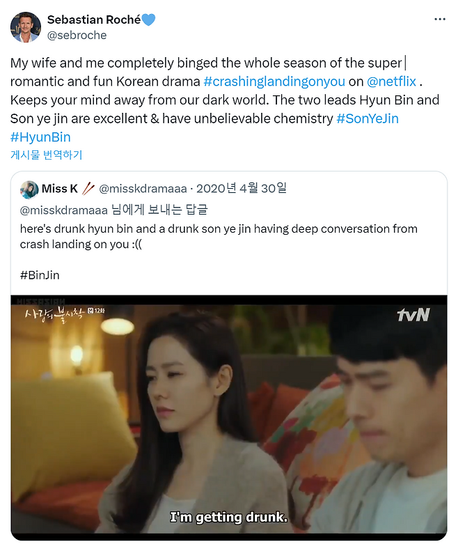 이름에서 알 수 있다시피 알리샤 해나 킴은 한국계 호주인인데, 세바스티앙 로셰는 2020년 자신의 SNS를 통해 아내와 함께 손예진과 현빈이 주연을 맡은 '사랑의 불시착'을 재밌게 봤다고 인증을 남긴 바 있다.
