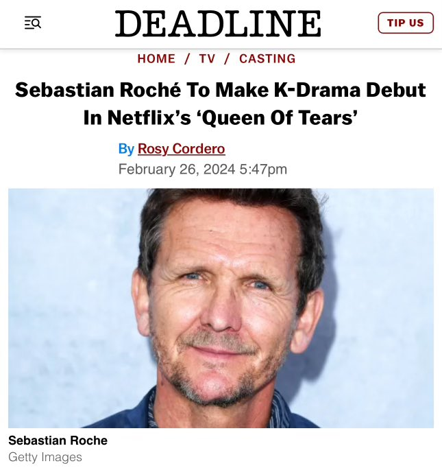 할리우드에서 활동 중인 배우 세바스티앙 로셰가 오는 3월 방영되는 tvN 드라마 '눈물의 여왕'에 출연한다는 깜짝 소식이다.