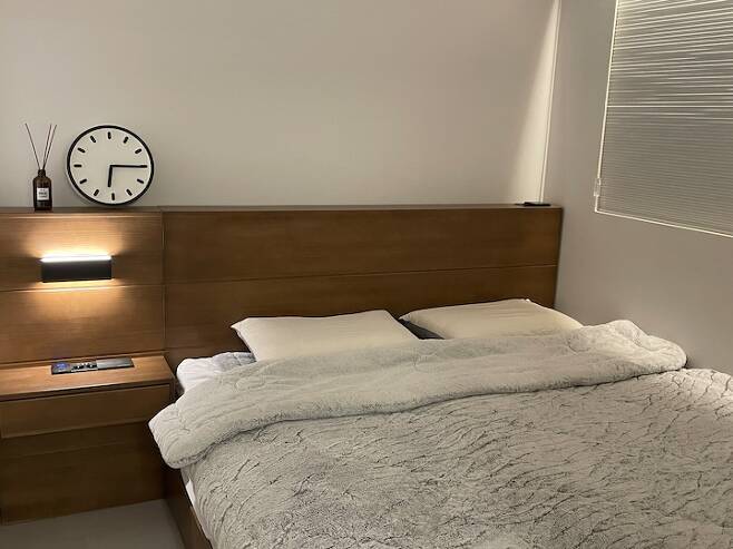 침대 프레임은 '목촌가구'라는 곳에서 자체 제작 원목 프레임으로 맞추었고, 양쪽에 콘센트를 활용할 수 있게 제작했답니다. 저희 방 크기에 맞게, 원하는 우드 색감과 형태를 고려할 수 있어서 딱 원하는 느낌의 프레임이 제작된 것 같아요. 직접 보았을 때도 색감이나 느낌이 저희가 생각했던 모습과 딱 일치해서 너무 만족하며 사용하고 있습니다~