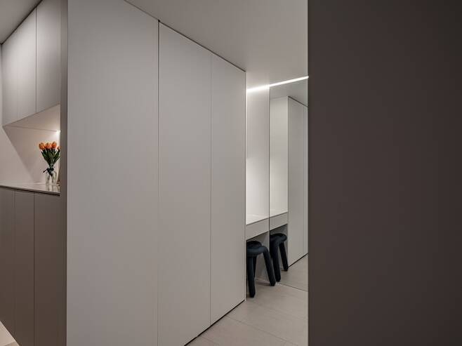 레이아웃을 변경하여 현관 앞 드레스룸을 제작했기에 자칫 답답할 수 있는 복도 부분을 월워셔 조명을 주어 좁은 복도에 확장감을 느끼게 해주었습니다.