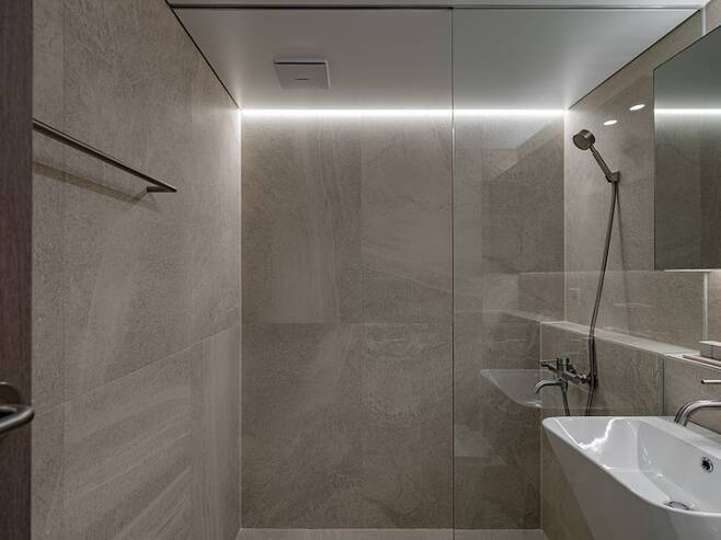 욕실은 600x1200 각 밝은 타일을 사용해서 좁은 욕실을 더 넓어 보이고 고급스럽게 연출을 했습니다~ 배수구는 트렌치 형태의 배수구로 변경하여 더 깔끔한 느낌이 나네요~