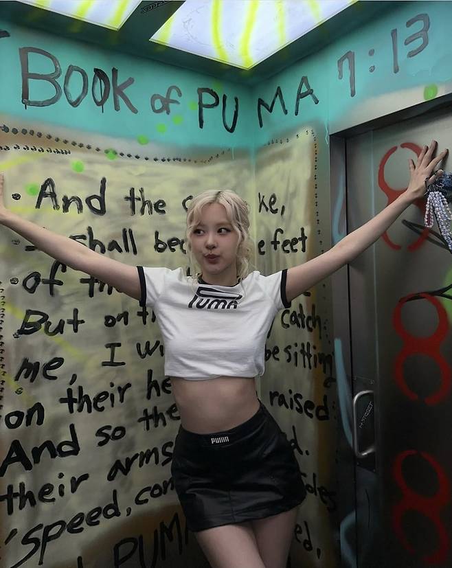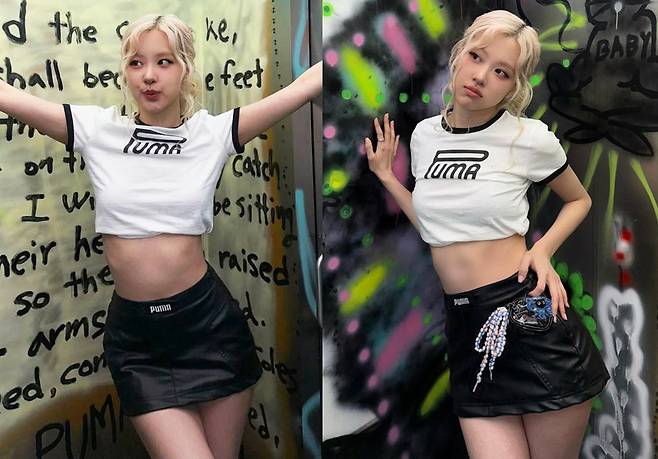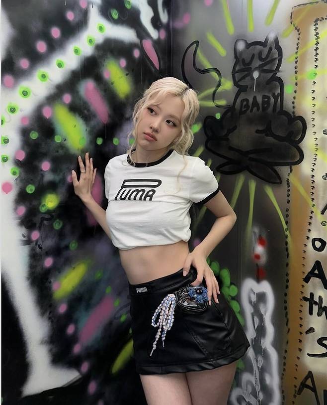 로제는 푸마 로고가 들어간 화이트 크롭 반팔 티셔츠에 블랙 미니 스커트를 매치한 Y2K 감성 스트리트룩을 선보였습니다.