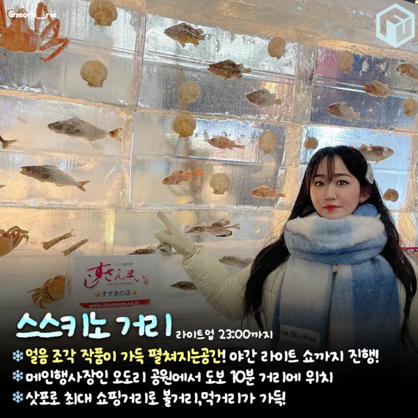 이후 1시간 늦게 소등되는 스스키노 행사장으로 이동해 쇼핑과 번화가의 분위기를 즐기며 투명하고 정교한 얼음 조각을 함께 관람하는 동선을 추천합니다.