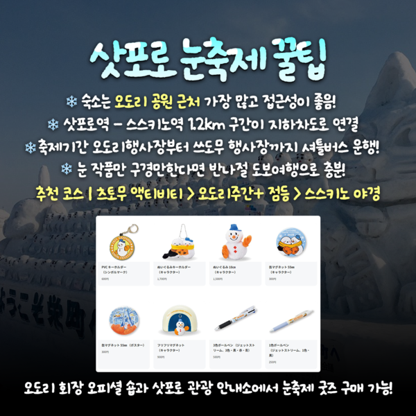 또 삿포로 눈축제의 추억을 간직하고 싶다면 기념품을 구매해 오시는 걸 추천드립니다. 삿포로 눈축제는 매년 다양한 굿즈들을 판매하는데, 삿포로 관광안내소와 오도리 회장 오피셜숍에서 구매가 가능합니다.