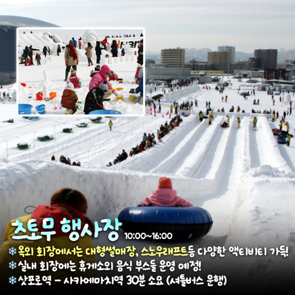 앞서 다른 행사장과는 떨어진 츠토무 행사장에서는 다양한 겨울 액티비티를 체험할 수 있는 곳입니다. 특히 높이 5m 이상의 대형 눈썰매장부터 스노우 래프트등 다양하면서도 독특한 겨울 액티비티를 체험할 수 있는데요.
