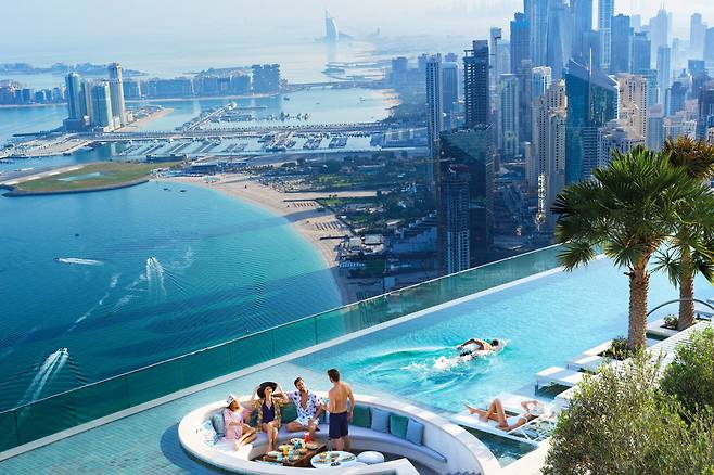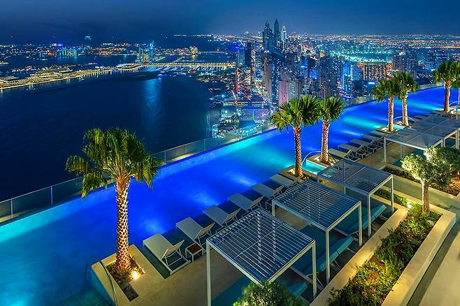 어드레스 비치 리조트 다음으로 손꼽히는 수영장입니다. 이곳은 '아우라 두바이 마리나 타워(Aura Dubai Marina Tower)' 최상층에 자리 잡고 있습니다. 이곳에서도 뛰어난 전망을 자랑하고 있어 여행객의 마음을 빼앗는데요. 우열을 가리기 힘들 정도로 두바이에서는 완벽한 인피니티풀을 즐길 수 있습니다.