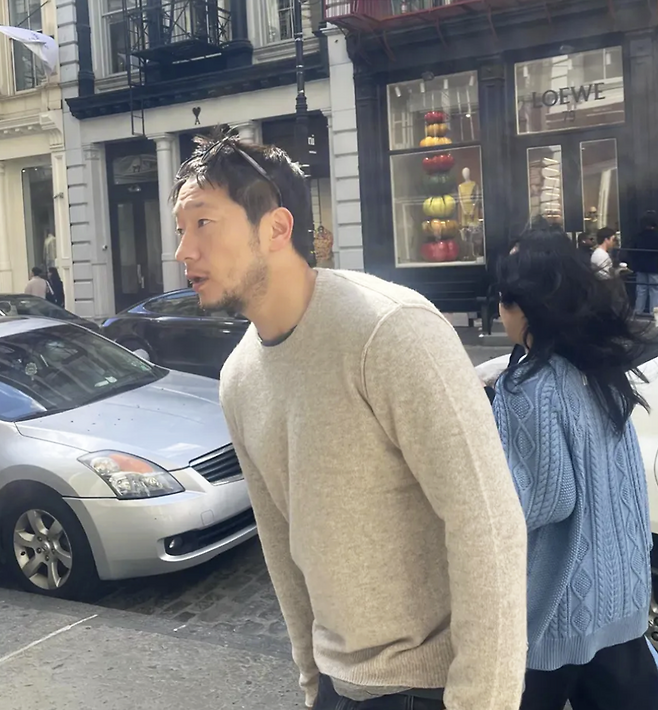 밝은 멜란지 니트와 짙은 인디고 블랙 데님 팬츠로 완성된 그의 스타일은 도시적 감성과 절제된 멋을 동시에 느끼게 하며, 패션 팬들의 시선을 사로잡았다.