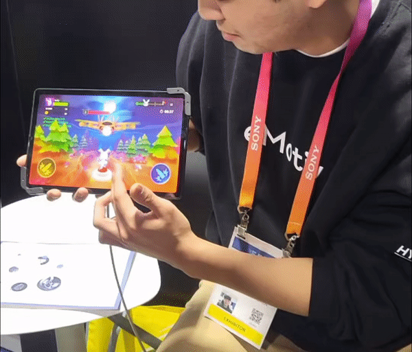 6일(현지시간) 미국 라스베이거스 CES 2023 스타트업 특화 전시장 유레카 파크에서 찾은 이모티브(eMotiv) 부스. 장인석 사업전략 매니저가 토끼 모양의 캐릭터를 좌우로 움직여 폭탄을 피하고, 동시에 비행기를 공격하는 게임 시범을 보였다. 주의를 기울여 캐릭터를 조종하지 않으면 금방 죽기 쉽상이었다.