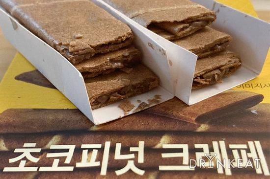 은색 포장지 속에 3개의 얇은 크레페가 들어있어. 외관상으로 크림이 눈에 보이지는 않아. 피넛과 초코가 적절하게 배분되어 있어 어느 하나 독보적으로 튀는 것 없이 잘 어우러져. 초코의 달달한 맛에 피넛의 고소한 맛이 더해져서 과하게 달거나 느끼하지 않아. 한 봉지 먹고, 바로 다음 봉지를 열게 되는 맛이야. 바사삭 부서지는 소리도 한몫해. 과자 부스러기가 많이 떨어지니까 엄마의 등짝 스매싱을 조심하자!