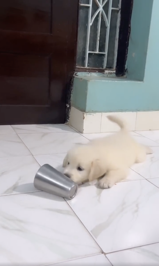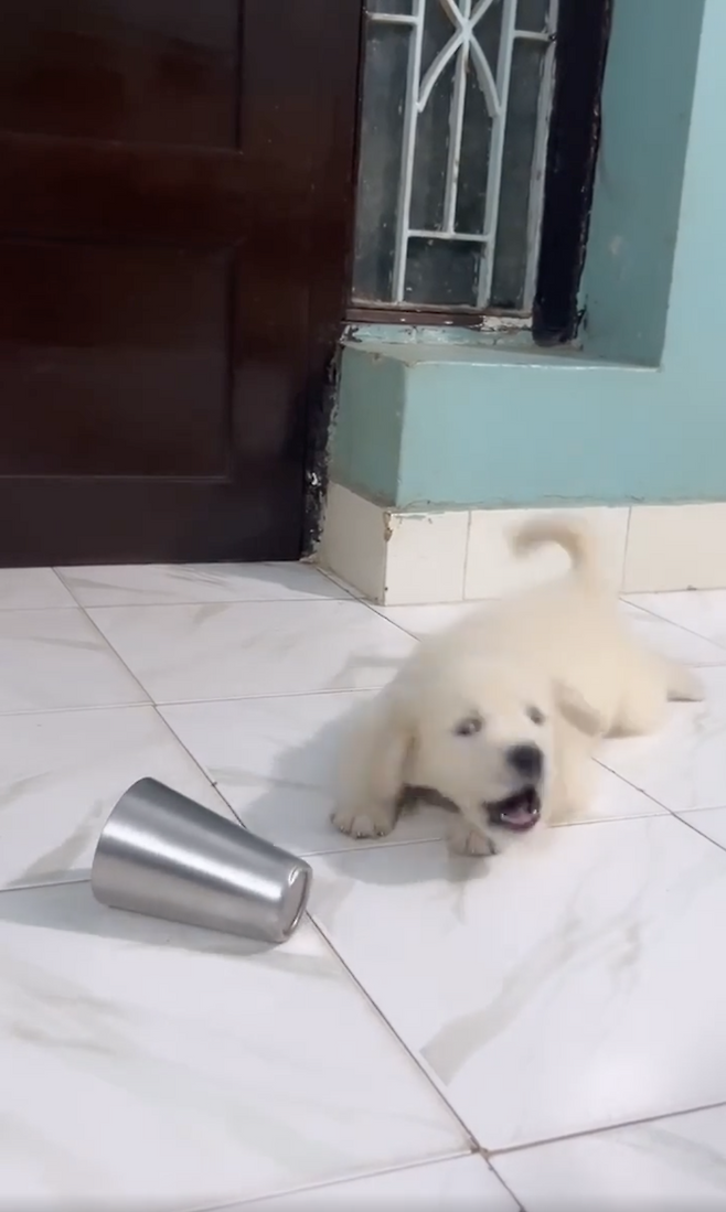 영상 속 강아지는 바닥에 놓인 컵을 앞발로 툭툭 건드리며 신중하게 행동합니다. 컵이 움직이자 강아지는 깜짝 놀란 듯 다시 멈칫하다가도 용기를 내어 컵을 향해 또다시 다가갑니다.