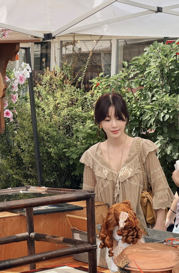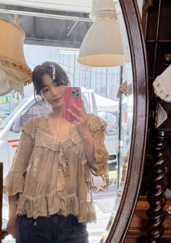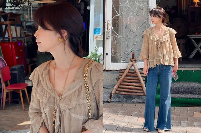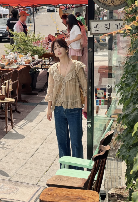 기은세는 이번 블라우스를 엔틱가구 거리라는 독특한 배경과 조화롭게 스타일링하며, 빈티지한 무드를 더욱 강조했다.
