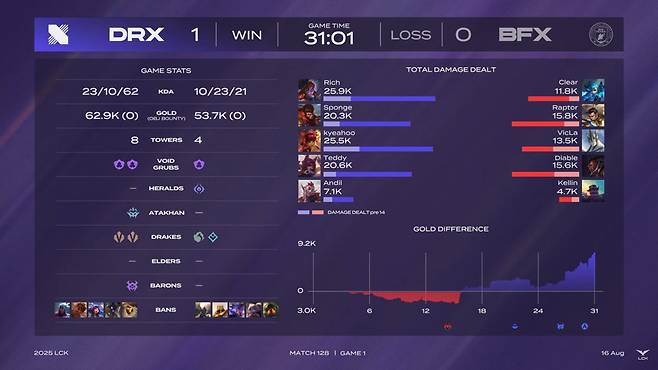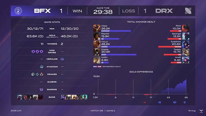 2025년 8월 16일, 종로 LoL 파크. 2025 LCK 4라운드에서 DRX가 BNK 피어엑스를 2:1로 꺾고 승리했다. DRX는 이로써 라이즈 그룹 4주 차 경기에서 처음 승리를 거두었다. BNK 피어엑스는 4라운드 전승을 기록하지 못했다. 한편, DRX의 승리로 DN 프릭스는 라이즈 그룹 5위가 확정되었다.
