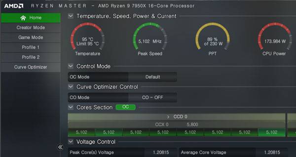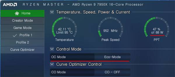 테스트에 사용된 라이젠 9 7950X는 라이젠 마스터를 통해 에코 모드를 활성화하면 전력 상한치가 230W에서 88W로 절반 이상 줄어든다. 당연히 온도와 발열도 대폭 낮아진다.