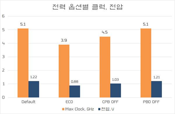 가장 효율적인 옵션으로 평가할 수 있는 CPB OFF 조건에서는 부스트 클럭 기능을 끈 만큼 최대 클럭이 베이스 클럭인 4.5GHz에 멈췄고, 이때 최고 전압은 1.03V를 기록했다. 반면 전력 효율을 우선시한 ECO 모드에서는 최고 클럭이 베이스 클럭에도 미치지 못하는 3.9GHz를기록했으며, 전압은 0.88V를 기록했다.