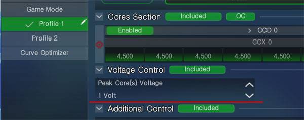 다음으로는 CPU 전력에 직접적인 변수로 작용하는 최대 전압을 제한하는 것이다. 오버클럭을 위해 전압을 높이는 것의 반대 버전으로 생각하면 쉽다. 라이젠 마스터를 통해 CPU에 공급되는 최대 전압을 전압을 손쉽게 조절할 수 있다.