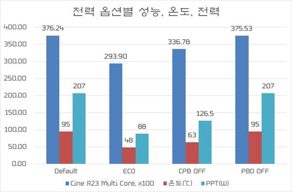 성능 자체는 기본 상태에서 가장 높고, PBO OFF, CPB OFF, ECO 모드 순이다. PBO OFF는 기본 상태와 거의 동일한 성능을 내주지만 그만큼 온도와 전력이 거의 동일해 높은 발열과 전력을 잡기 위한 언더볼팅(클럭)의 의미가 없다.