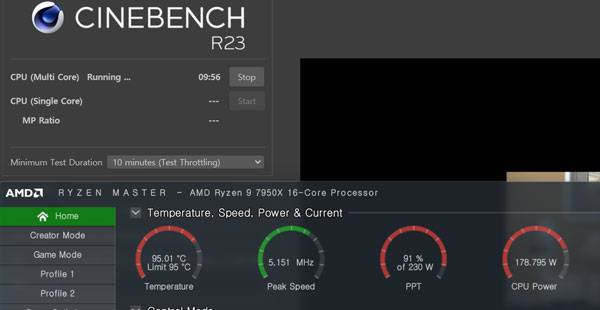 하지만 향상된 성능은 발열과 전력 소모량이라는 반대급부를 요구했고, 이에 라이젠 9 7950X 같은 플래그십 모델은 3열 수랭 쿨러로도, 멀티 코어 활용도가 높으면서도 상대적으로 작업 부하가 낮은 시네벤치 R23 벤치마크에서도 온도제한치인 95℃를 가뿐하게 찍었다.