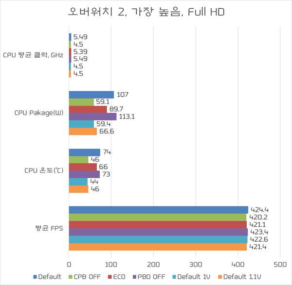 전력 옵션에 따른 게임 성능은 거의 차이가 없었다. 하지만 온도와 전력 수치는 상당한 차이를 보이는데, CPB OFF와 언더볼팅 1V 상태에서는 CPU 온도가 무려 30℃ 가까이 떨어졌고, CPU 패키지 전력도 거의 50W 가까이 낮아져 절반 수준에 머물렀다.