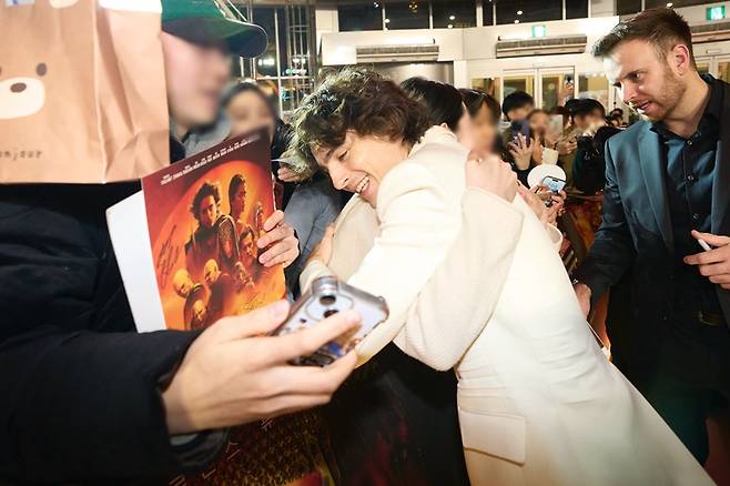 이날 레드카펫은 티모시 샬라메를 비롯해 젠데이아 콜먼, 오스틴 버틀러, 스켈란 스카스가스와 연출자인 드니 빌뇌브 감독이 참여했다. '듄' 시리즈의 창조자인 이들을 직접 만나려는 팬들은 행사 전날인 21일 오후부터 행사장에 모여들었고, '24시간 밤샘'까지 불사했다. 그 뜨거운 열기를 현장에서 확인한 티모시 샬라메는 팬들과 포옹까지 하면서 감사한 마음을 표했다.