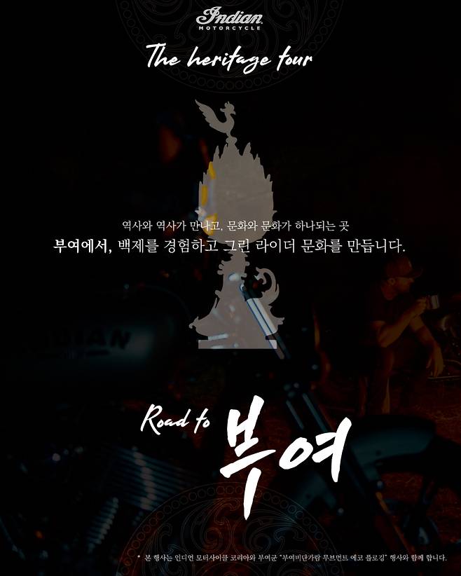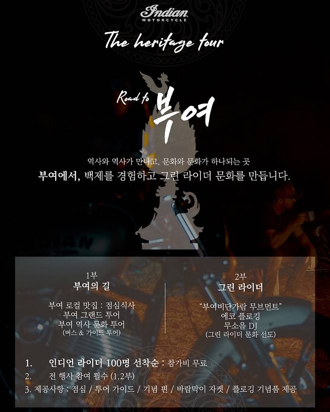 인디언 모터사이클 코리아는 오는 9월 20일(토) 충남 부여에서 새로운 투어 프로그램 ‘더 헤리티지 투어 – 로드 투 부여’를 선보이며 사전 접수를 진행했으며, 참여자가 몰려 단 하루 만에 조기 마감되었다고 밝혔다.