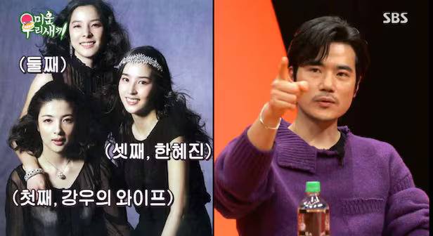 김강우의 아내 한무영은 배우 한혜진의 세 자매 중 큰 언니입니다. 김강우는 "세 자매 중 우리 아내가 제일 예쁘다"며 사랑꾼 면모를 드러냈죠.