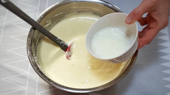 반죽이 모두 완성되었다면, 우유와 식물성기름을 넣고 다시 섞으세요.