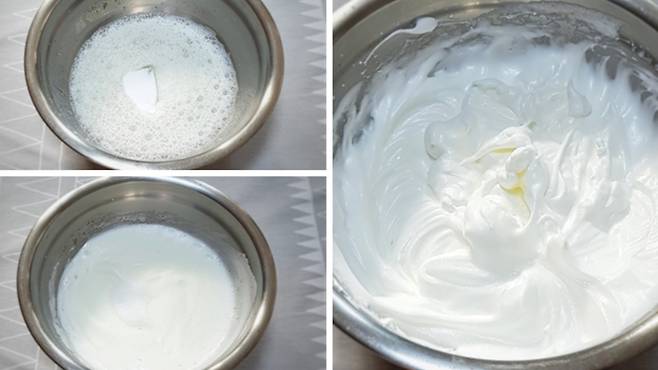 설탕을 계속 나눠가며 휘핑기구로 계속 저어가며 머랭을 만들어 주세요. 머랭의 농도는 쫀득쫀득한 느낌이 들 때까지 저어주셔야 해요. 휘핑기구를 들어 올렸을 때 '원뿔 모양'이 만들어지면 완성이랍니다.