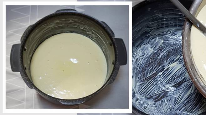 전기밥솥을 준비한 후 버터 조금을 넣고 주변부에 모두 발라 주세요. 그래야 카스테라가 들러붙지 않고 예쁜 모양으로 나오게 된답니다. 그리고 버터의 고소함이 더해져 더욱 맛있어요.