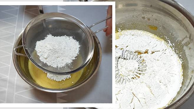 이제 노른자에 박력분을 체 쳐가며 넣어 주세요. 그래야 밀가루 입자가 고와져 맛있는 카스테라가 완성된답니다.