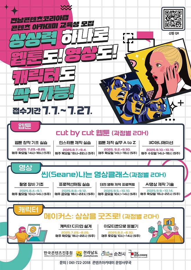 과정별 모집 인원은 15명 내외이고, 교육 신청은 7월 7일부터 7월 27일까지 포스터에 안내된 QR코드 또는 구글폼을 통해 신청서를 제출하면 된다.웹툰 교육과 영상 교육은 총 80시간 과정으로 분야별 기초교육을 시작으로 제작 실습과 실무까지 폭넓게 다룬다.