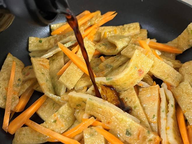 당근을 넣어 함께 볶다가 설탕 커피스푼으로 1개 정도 넣어 같이 볶습니다. 간장을 넣기 전 설탕을 먼저 넣으면 입자가 큰 당근과 어묵에 단맛이 먼저 스며들어 양념의 겉돎을 방지해 줍니다.
